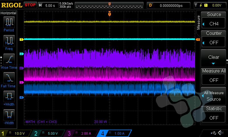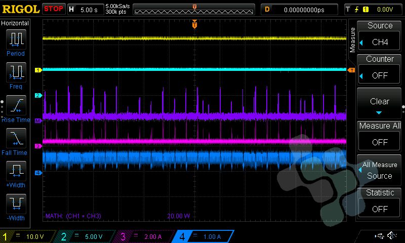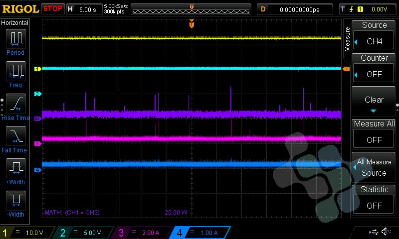 Kanal 1 (gelb) stellt die Spannungsmessung 12 V bei einer Darstellung von 10 V je Kästchen dar. Kanal 2 (türkis) stellt die Spannungsmessung 5 V bei einer Darstellung von 5 V je Kästchen dar. Kanal 3 (rosa) stellt den Stromverlauf auf der 12 V Schiene dar, bei einem Verhältnis von 2 A je Kästchen. Kanal 4 (blau) stellt den Stromverlauf der 5 V Schiene bei einem Verhältnis von 1 A je Kästchen dar. Der mit MATH gekennzeichnete Kanal stellt das Produkt einer Multiplikation von Kanal eins und drei dar, also die Leistung auf der 12 V Schiene. Für 5 V müssen wir diese Berechnung von Hand durchführen. Da das Oszilloskop uns eine .csv Datei mit allen Messwerten erstellt hat, ist das kein Problem.